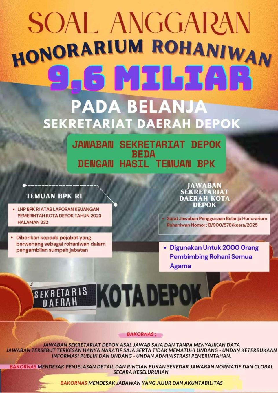Hermanto, S.Pd.K., S.H., CPS., CLS., CNS., CHL selaku Ketua Umum BAKORNAS, menyampaikan dalam keterangan resminya pada awak media (26/5/25), bahwa Anggaran honorarium Rohaniwan sebesar 9,6 Miliar tersebut dipertanyakan berawal dari temuan Badan Pemerikasa Keuangan Republik Indonesia pada LHP BPK Atas atas Laporan Keuangan Pemerintah Kota DepokTahun 2023, yang terdapat pada halaman 332.