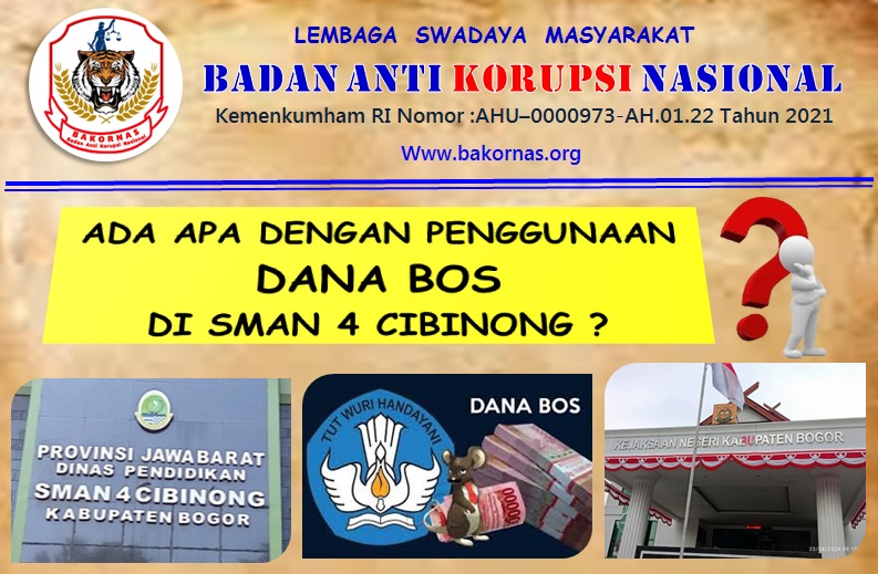 Hermanto, S.Pd.K., CPS., CLS., CNS., CHL selaku ketua Umum Badan Anti Korupsi Nasional mengatakan bahwa BAKORNAS telah beberapa kali melayangkan surat Permohonan Klarifikasi dan Penjelasan Penggunaan Dana BOS terhadap SMAN 4 Cibinong yang berada di Jalan bojong koneng RT 01 RW 01, Kelurahan Cibinong, Kecamatan Cibinong, Kabupaten Bogor. Dikatakannya pada awak media, (26/8/24).
