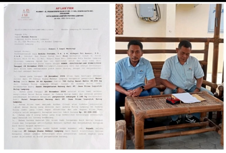 “Selang Beberapa Hari kemudian (Aaqyud) Kepala Jasa Prima Logistik (JPL) Bukog memenuhi panggilan pada (04/12/24) dikantor hukum AP LAWFIRM jl. Perum korpri blok E3 no. 11 sukarame kota Bandar Lampung untuk klarifikasi. Ia mengatakan untuk permasalahan claim dari 760 sak/38.000 kg yang penyusutan berat 2.160 kg akan dilimpahkan ke PT. Ceng Jie Expedisi lampung karna ia yang berkontrak ke JPL Bukig, dan PT Ceng Jie Expedisi Lampung akan meng claim PT. CBM, kemudian dari pada itu lebih jelas Kepala Kanwil Bulog Lampung yang bisa menjelaskan dan bertanggung jawab dalam persoalan ini,” kata Nurullah berdasarkan keterangan para tim PWDPI.
