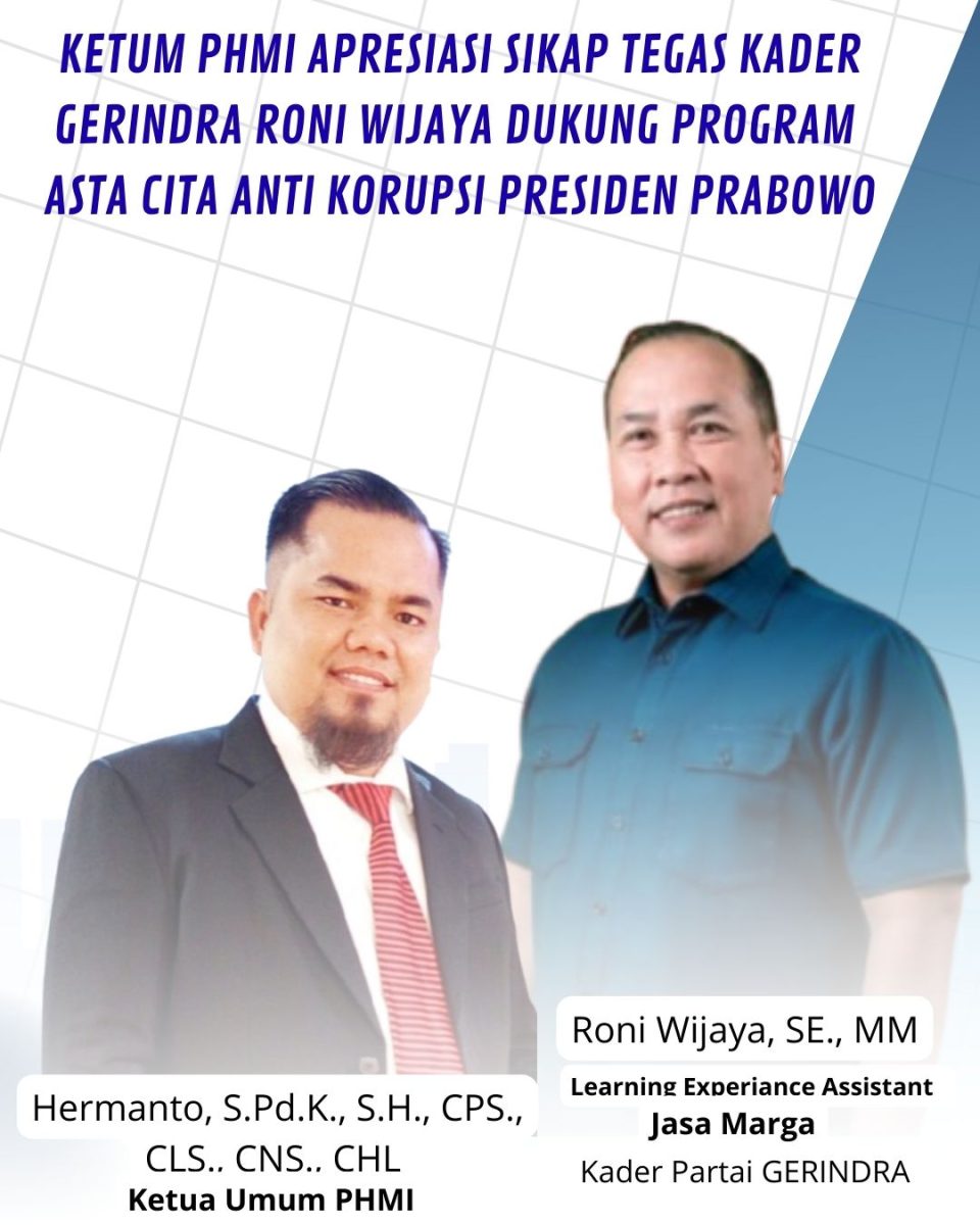 Roni Wijaya menuturkan bahwa dirinya selaku Kader Partai Gerindra sangat mendukung penuh Keberanian Presiden Prabowo dalam mengambil berbagai kebijakan untuk memperbaiki tata kelola pemerintahan, serta meningkatkan kualitas pelayanan publik, sehingga menjadi pelayanan yang humanis pro rakyat.