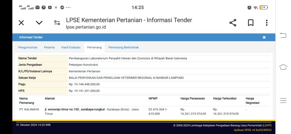 Kode Lelang: 16249212, pada Satuan Kerja Balai Penyidikan dan Pengujian Veteriner Regional III Bandar Lampung dengan Pagu Anggaran Rp.19.144,448,000.00, Harga Perkiraan Sendiri (HPS) Rp.19.19,141,331,000.00 Angaran APBN Tahun 2024.
