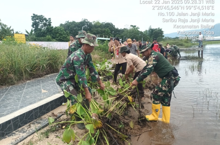 Ia mengatakan kegiatan pengangkatan eceng gondok diawali dengan apel dan dilanjutkan kegiatan pembersihan enceng gondok bersama Koramil 17/Balige, Polsek Balige, Masyarakat dan peserta didik Pramuka di Pantai Janji Maria Desa Sariburaja Kelurahan Balige Kabupaten Toba