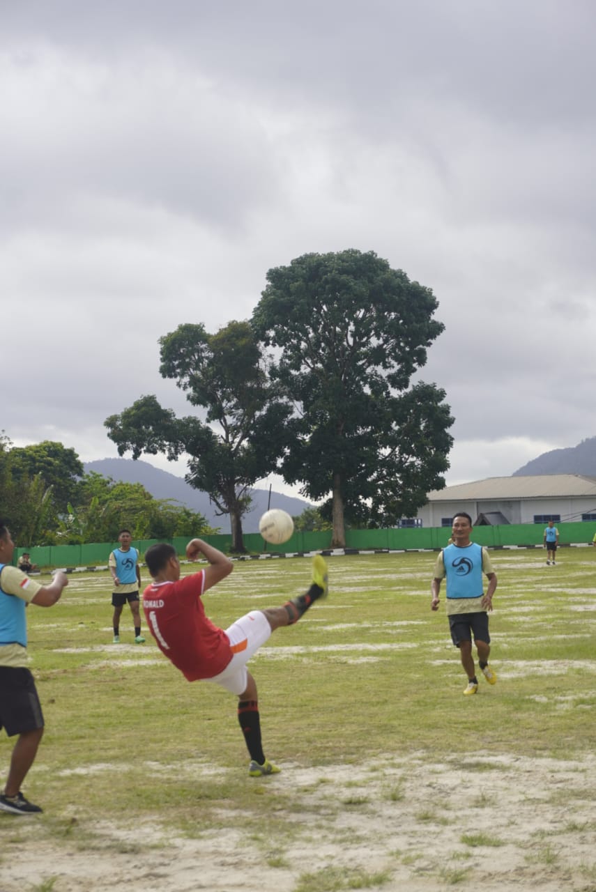 Sebelum pelaksanaan olahraga bersama, terlebih dahulu dilaksanakan peregangan otot, setelah itu bermain sepak bola.