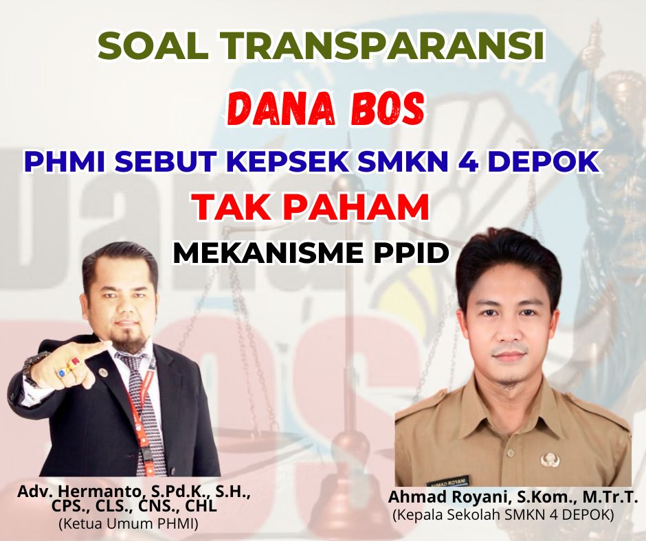 Advokat Hermanto menyampaikan bahwa PHMI telah mengirimkan surat PPID dengan nomor 143/DPP/PHMI/II/2026 dan telah diterima oleh pihak SMKN 4 Depok pada tanggal 12 Februari 2026, namun surat PPID tersebut dibalas dengan ditandatangani langsung oleh Ahmad Royani, S.Kom., M.Tr.T. selaku Kepala Sekolah SMKN 4 Depok.